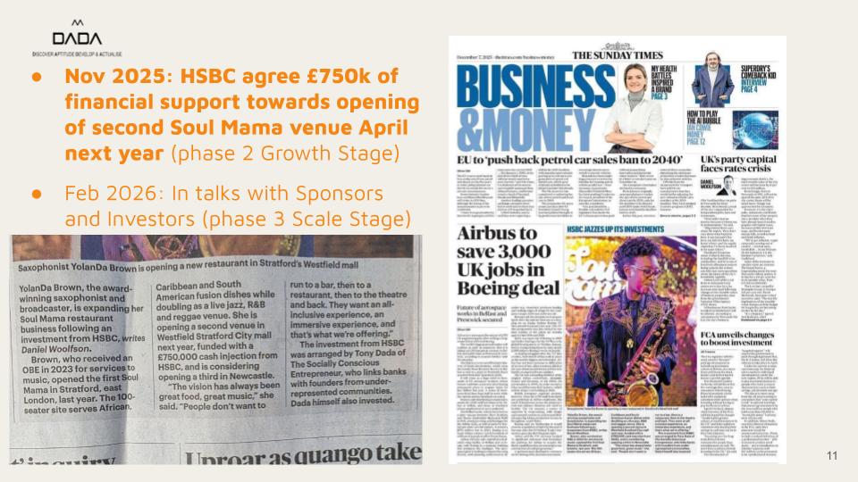 Recently, we hit the front page of The Times and Sunday Times Business Section. Read our latest Investment success story: YolanDa Brown's Soul Mama Venue